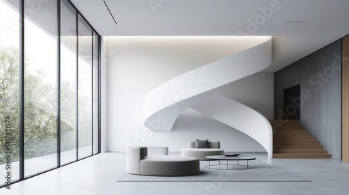 Modern twolevel loft house with a curved architectural staircase, soft LEDlit walls, and a contemporary luxury aesthetic