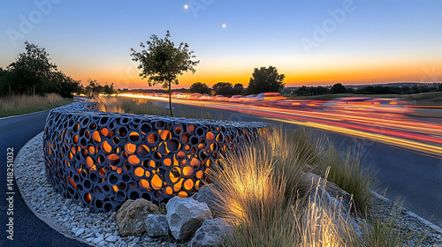 At dusk light trails blur past a unique modern art installation near a road bathed in the soft glow of the setting sun