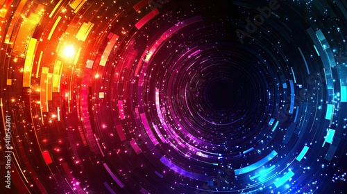 A vibrant, colorful, and intricate abstract design with concentric circles and glowing segments.