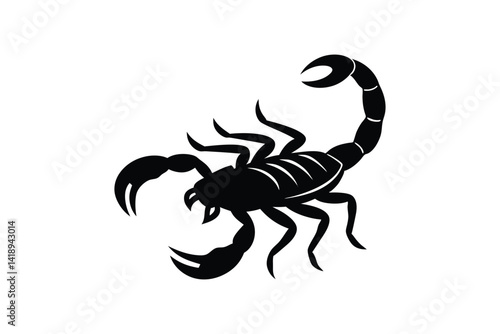 Silhouette art illustration of a scorpion with arched tail and pincers raised.eps