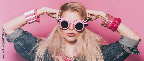 Pop girl portrait wearing odd sunglasses and posing letterbox