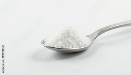 Spoonful of white sugar against white backdrop, domestic, ingredient