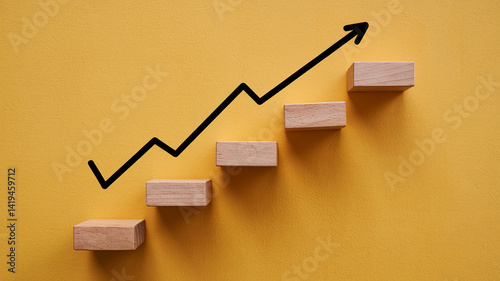 Wooden blocks ascending a drawn upward arrow on yellow background, symbolizing growth, progress, and success in business