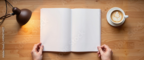 Hands holding blank magazine spread on wooden desk, creative inspiration