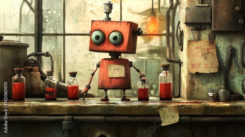 Rusty red robot in a cluttered laboratory setting.