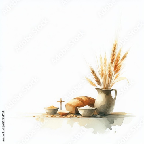 Watercolor illustration of eucharist symbols bread wheat cross faith and communion art