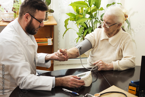 Prywatny gabinet lekarski. Lekarz geriatra przyjmuje pacjentkę i mierzy jej ciśnienie.