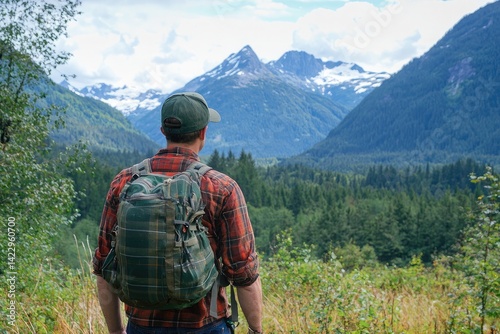 A man with backpack standing in front of mountains, looking at the view, back shot, wearing cap and shirt, outdoor adventure vibe, travel concept