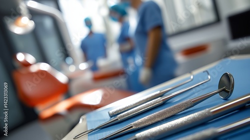 Dentist treating patient, close-up view of dental tools and chair