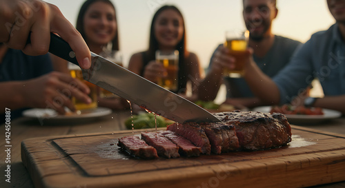 Slicing a juicy grilled steak at a vibrant outdoor gathering with friends, creating a delicious centerpiece for their convivial feast.