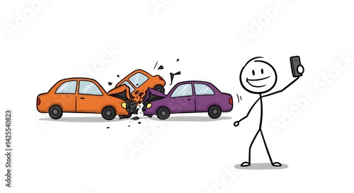 Careless Stick Figure Taking Selfie at Car Crash