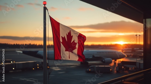 The Canadian flag waving at an airport, symbolizing global connection and travel,