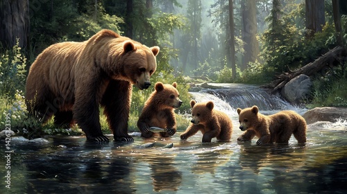 Family of bear including adult bear cub fishing together riverbank adult bear teaching cub how fish clear flowing river surrounded lush greenery tree scene capture dynamic energy of cub trying catch