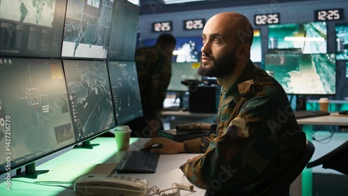 Military soldier in mission control center overseeing national safety operations with devices, close up. Middle Eastern army specialist examining data in monitoring room command center, camera B