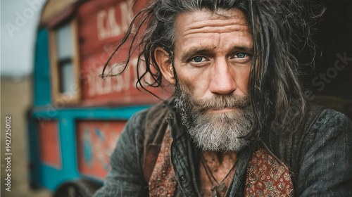 A gypsy man with a beard and unkempt hair stands in front of a gypsy caravan