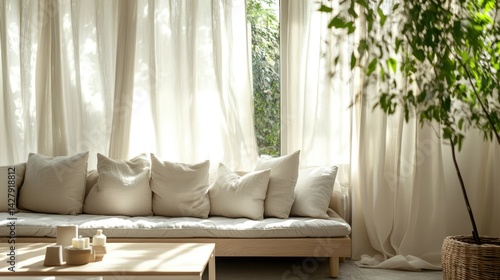 Bright living room with large windows, sheer curtains, and potted plants