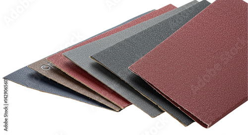 A close up shot showing an assortment of sandpaper sheets in varying colors and grit levels neatly stacked