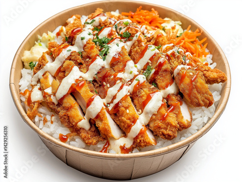 Create a studio photograph of a cardboard bowl, on a white background. Inside the bowl: This image shows a delicious Asian-inspired rice bowl topped with crispy golden-brown breaded chicken cut into