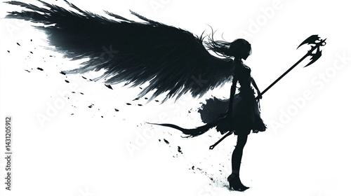 Dark angel silhouette with large wings and halberd.