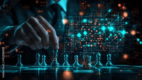 Strategic chess pieces on glowing board with digital network overlay and hand moving pawn, representing business strategy and technological advancement in modern era.