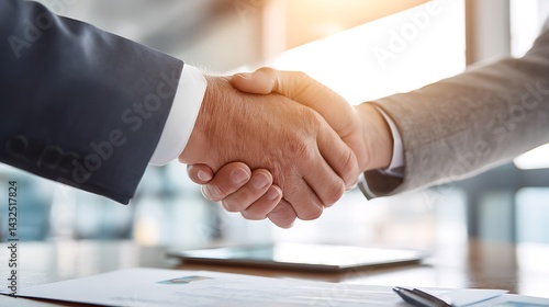 Business professionals shaking hands in agreement at the office