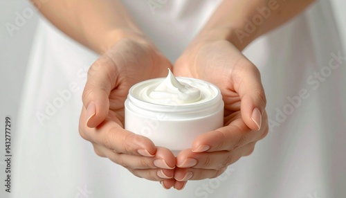 Primer plano de un par de manos jovenes sosteniendo un tarro de crema corporal para conceptos de cudado de la piel y cosmetología