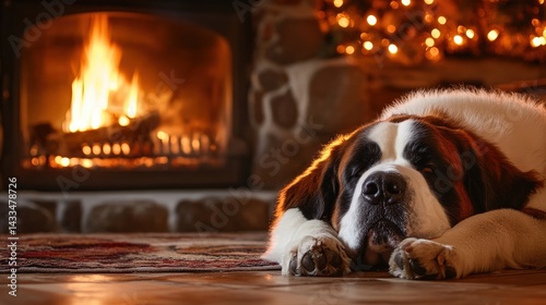 A gentle Saint Bernard resting in front of a cozy fireplace during winter.