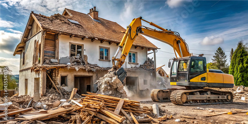A large excavator is tearing down an old residential building while debris and rubble scatter across the construction site. Bright skies enhance the daytime activity