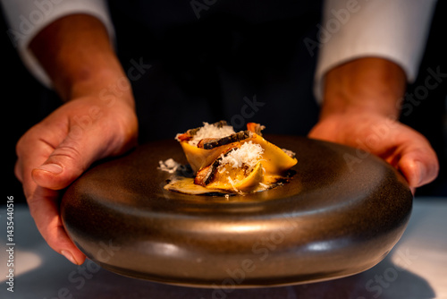 Assiette gastronomique colorée décorée avec soin, mêlant textures et nuances vives pour une présentation élégante et appétissante.