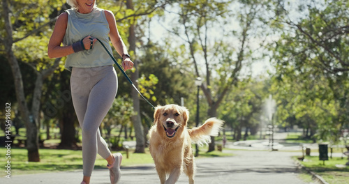Active, dog walking and running with woman in park for cardio exercise, fitness or health hobby. Leash training, obedience and pet performance with animal owner outdoor in nature for summer workout