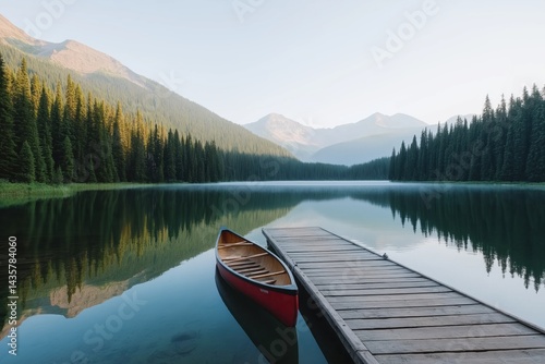 Serene canoe on mountain lake with wooden dock amidst pine forest at sunrise