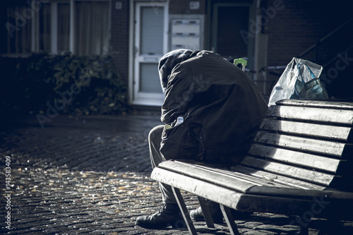 Einsamer Mann sitzt traurig auf einer Bank.