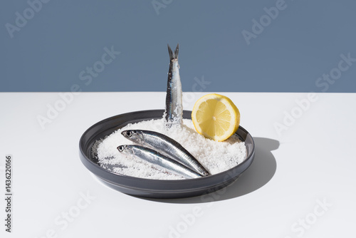 Tres anchoas frescas con limón sobre un plato lleno de sal sobre fondo azul