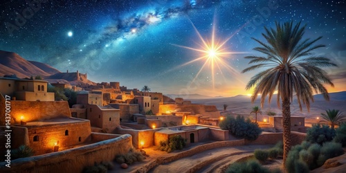 Ethereal glow of a star shining brightly in the dark night sky over ancient Bethlehem landscape with terracotta roofs and palm trees , celestial, landscape