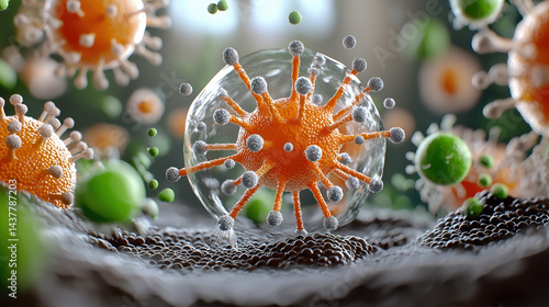 Virus particles interacting with host cells in a microscopic view