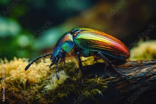A vibrant, iridescent beetle crawls on a mossy log in a lush, dark forest.