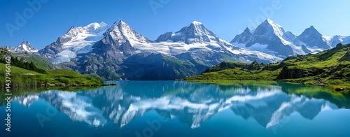 Stunning panoramic view of Mont Blanc and surrounding Alpine peaks mirrored in crystal-clear, glass-like lake water.