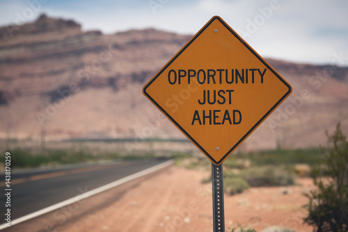 Orange diamond-shaped road sign against blurred desert landscape, displaying "Opportunity Just Ahead," conveying optimism and anticipation for future success