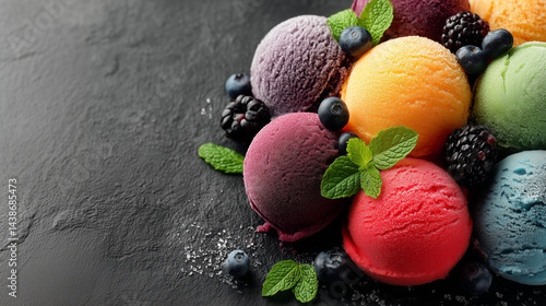 Kolorowe gałki lodów ułożone z jagodami i miętą na czarnym tle kamienia