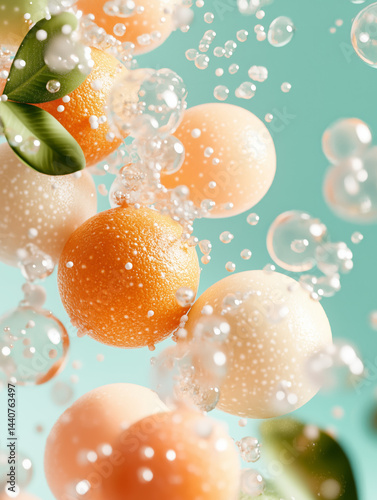 Dynamiczna kompozycja pływających pomarańczy, bąbelków i kropelek wody na jasnoniebieskim tle
