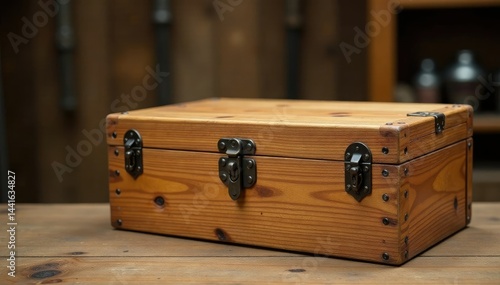 Handmade wooden toolbox with metal locks and hinges, woodworking, handmade