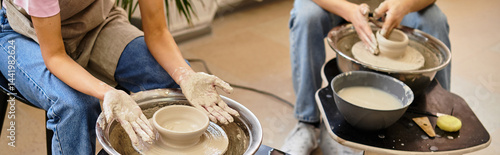 Young couple creating pottery together in a vibrant art studio filled with creativity and love