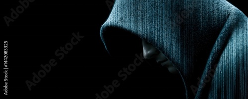 A mysterious hooded figure is shrouded in darkness, with only part of their face visible under a textured hood.