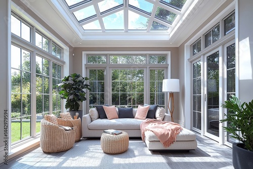 Modern sunroom with glass roof, large windows, pink throw sofa, and clear blue sky visible through skylight, overlooking garden.