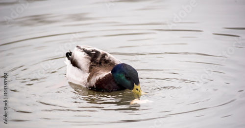 Samiec kaczki krzyżówki (Anas platyrhynchos) pływając w wodzie wyławia z n niej chleb. Ptak o charakterystycznej opalizująco zielonej głowie, żółtym dziobie i brązowej klatce piersiowej