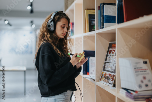 A young student wearing headphones takes notes in a contemporary library setting. The focus is on concentration and self-study in a school environment. Books and resources are visible on the shelves.