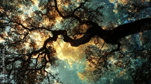 A mystical tree with branches that weave through both the terrestrial and heavenly realms, bathed in divine light, representing the connection between all life in the universe.