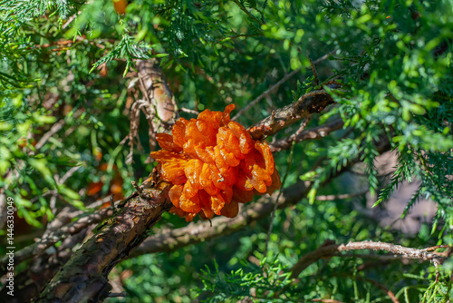 Close-up of cedar-apple rust (Gymnosporangium juniperi-virginianae) in its telial stage on a juniper branch, showing bright orange gelatinous fungal structures