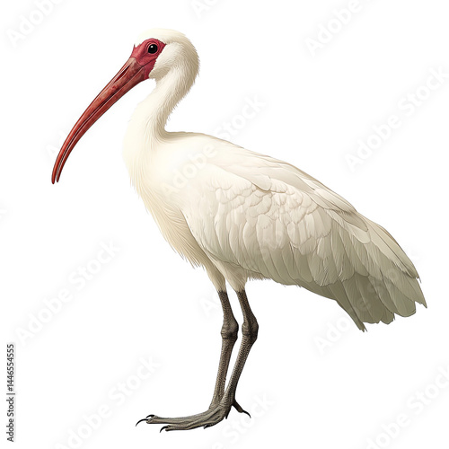 Majestic white bird with long red beak stands gracefully, showcasing its elegant feathers