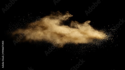 Gold colored powder explodes on a black background. A cloud of particles floats and dissipates